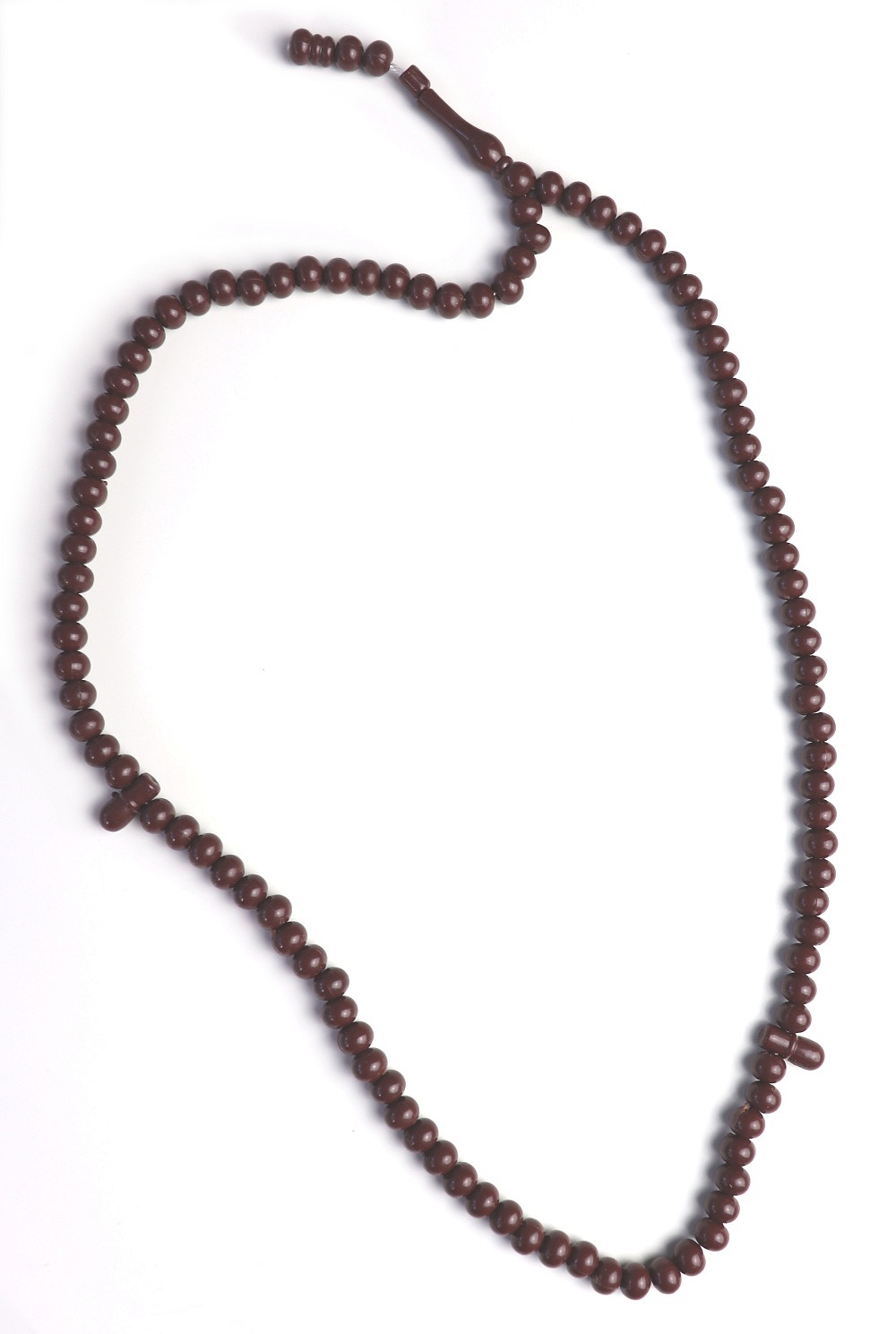 Chapelet 99 grains (boules rondes en plastique) de couleur marron foncé, avec séparateur tous les 33 grains.