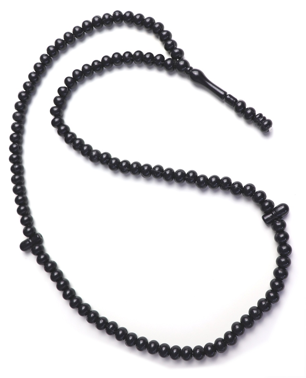 Chapelet 99 grains (boules rondes en plastique) de couleur noir, avec séparateur tous les 33 grains.