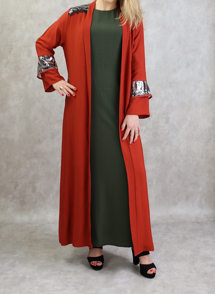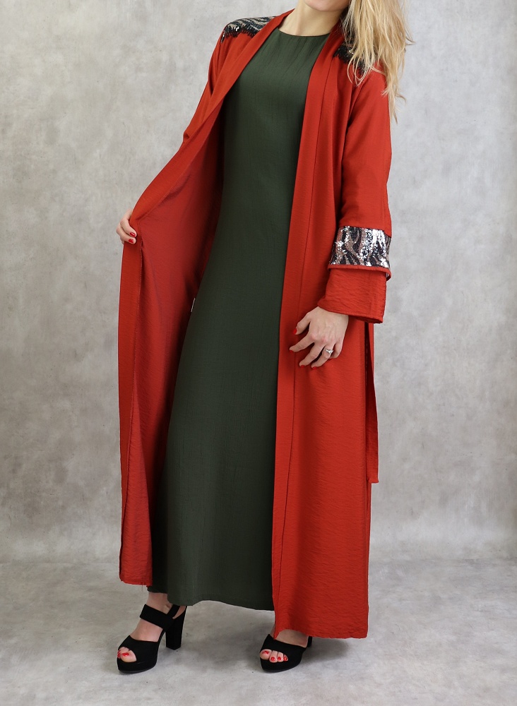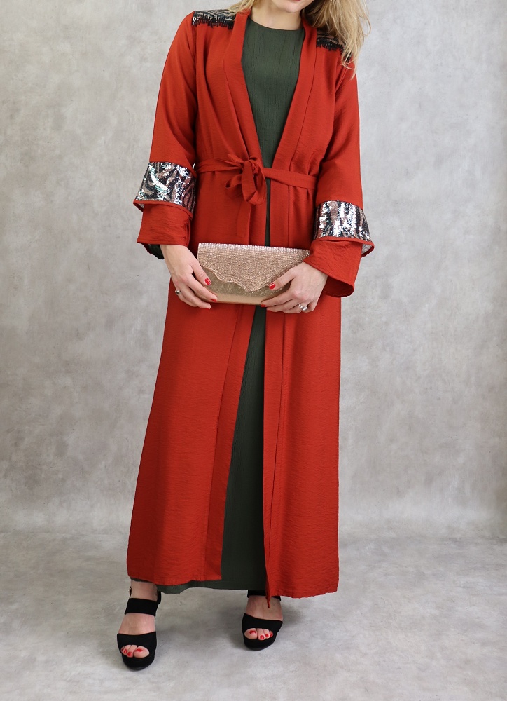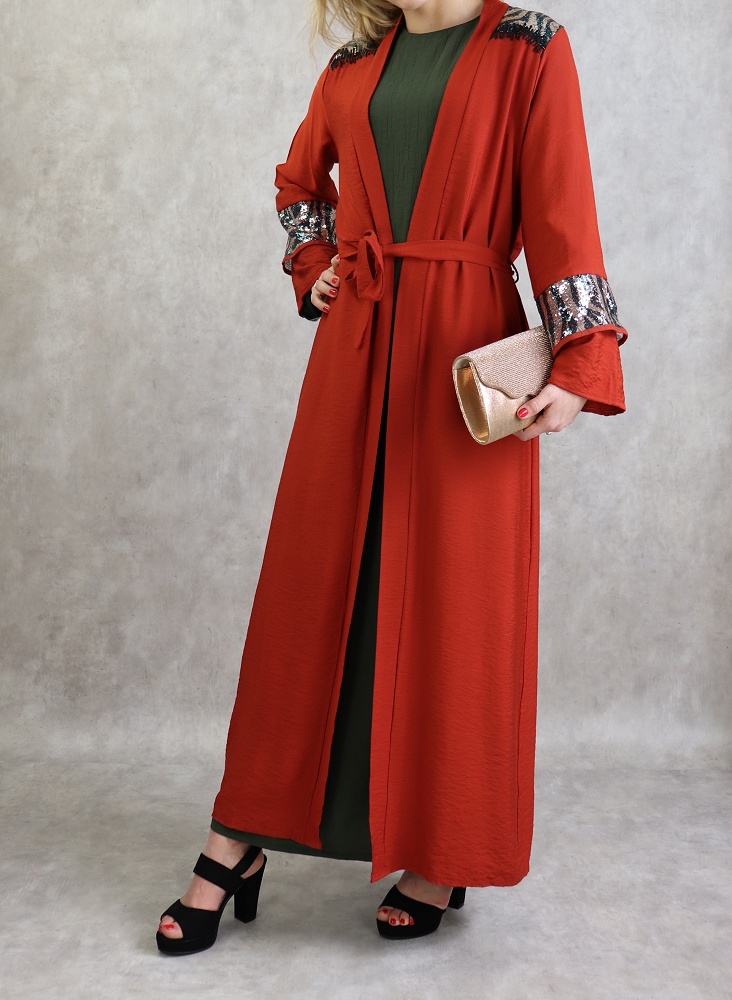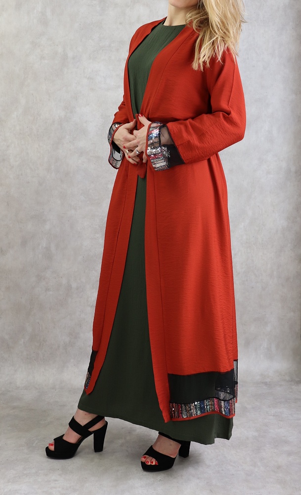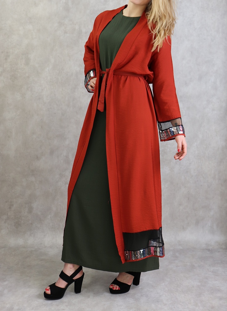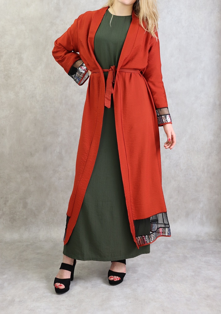 kimono long orné de tulle et strass de couleur brique Vetement & Accessoire