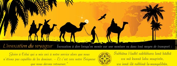 Invocation à dire lorsqu'on monte sur une monture ou dans tout moyen de transport : "Gloire à Celui qui a mis ceci à notre service alors que nous n’étions pas capables de les dominer. – Et c’est vers notre Seigneur que nous devons retourner."