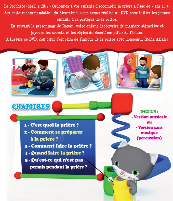 En suivant le personnage de Rayan, votre enfant découvrira de manière attractive et joyeuse les secrets et les règles du deuxième pilier de l’Islam. A travers ce DVD, son cœur s’emplira de l’amour de la prière avec douceur... Incha Allah !