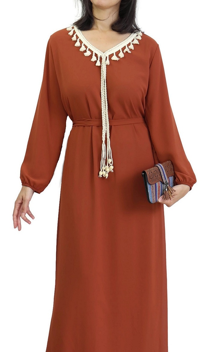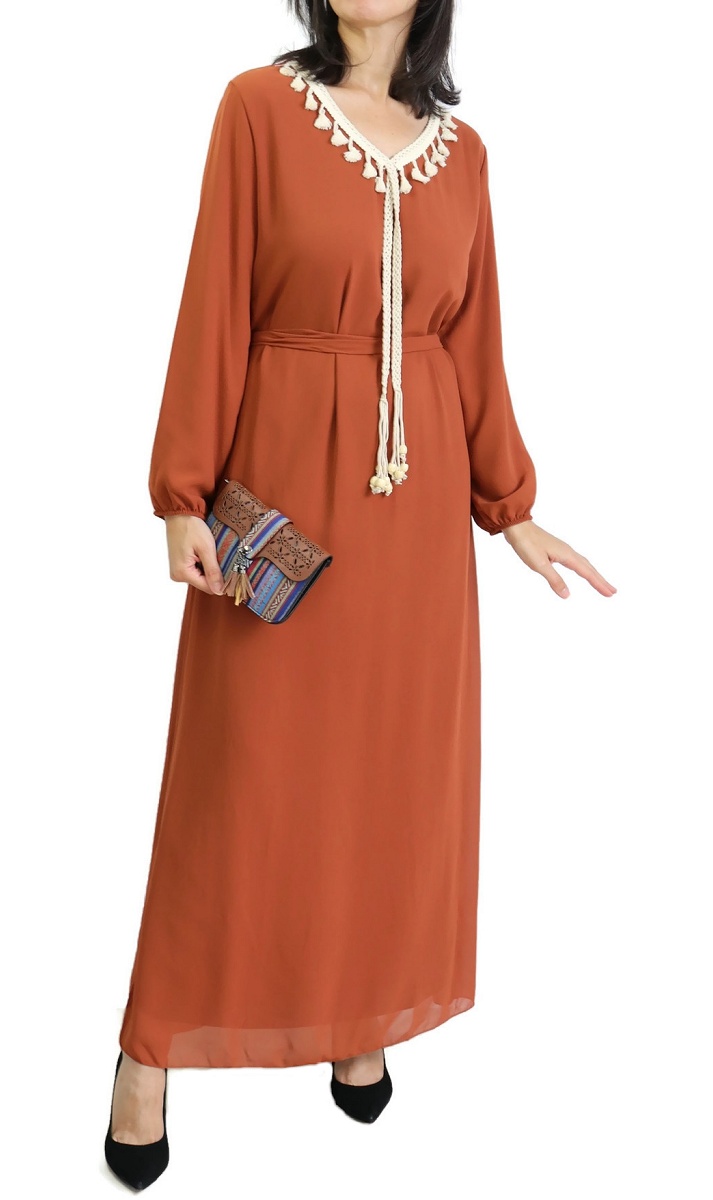 Robe col V entièrement doublée ornée de cordons beiges tressés, avec une jolie ceinture fine à nouer autour ou par derrière pour un effet cintré. Robe entièrement doublée. Tissu de type mousseline.