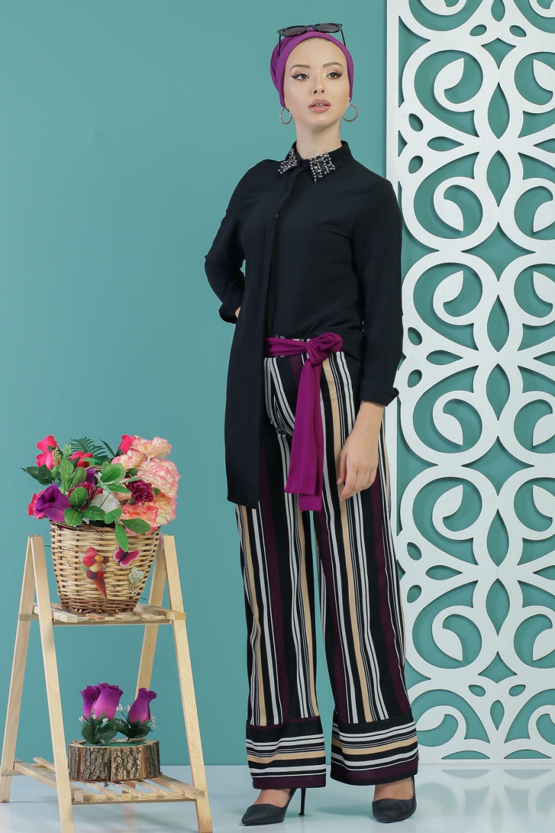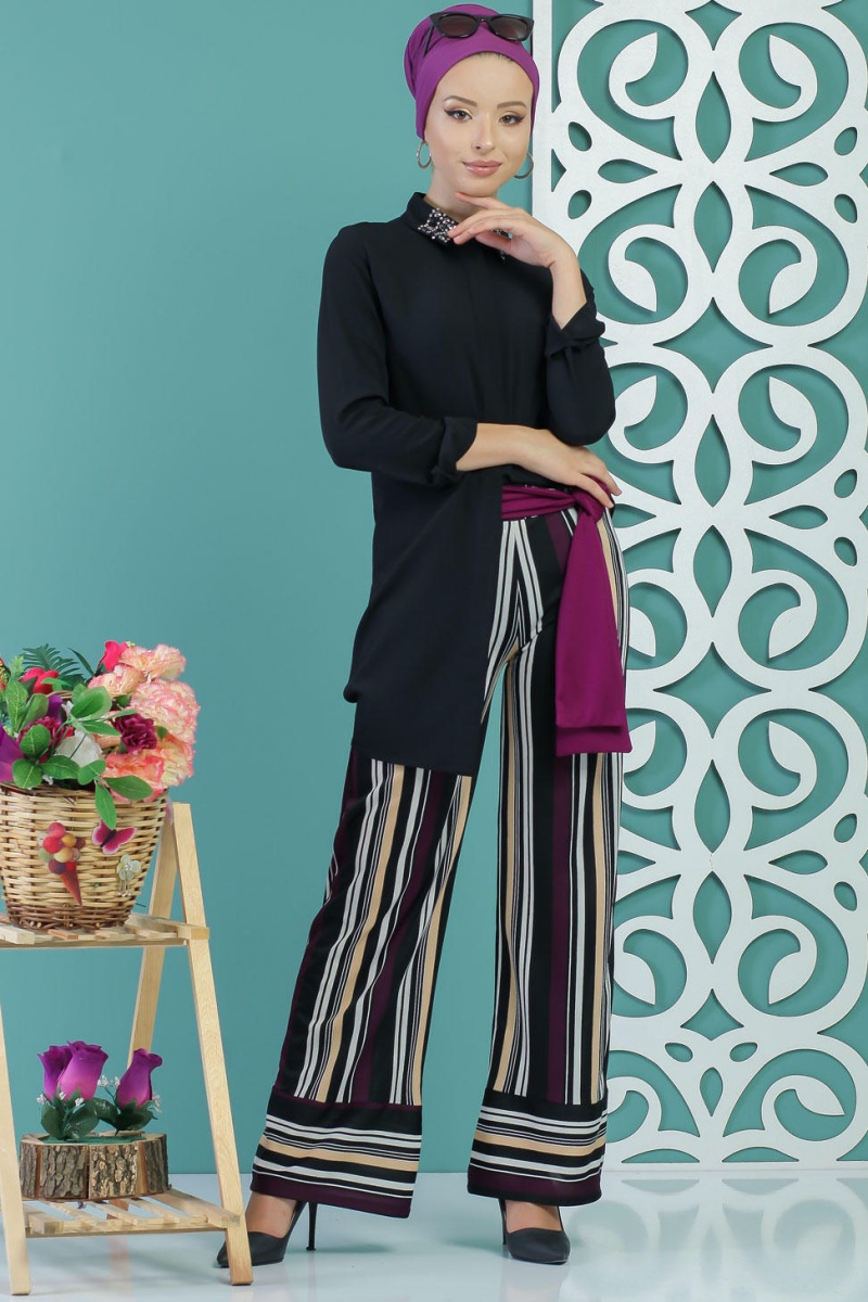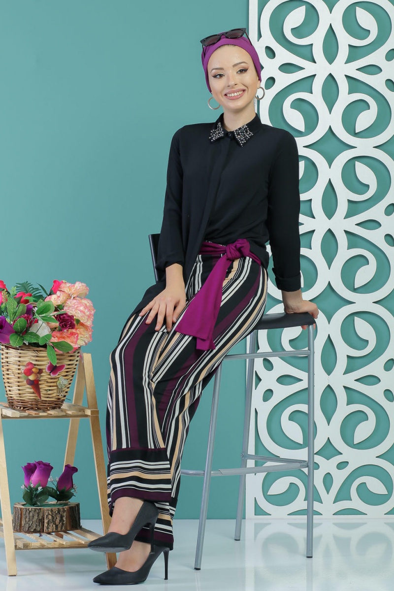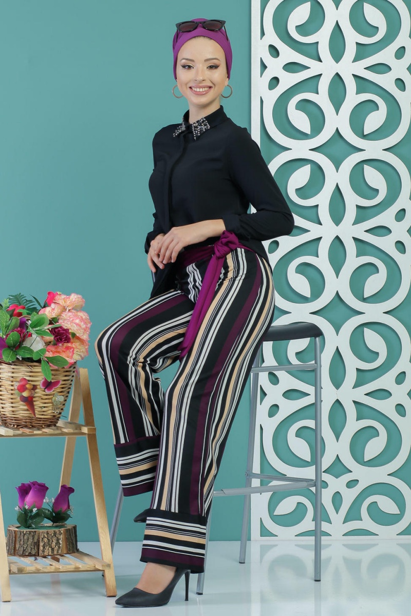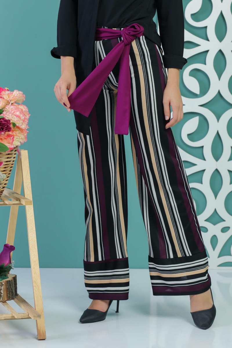 Pantalon femme chic à rayures noires, beiges et violettes avec ceinture violette Vetement & Accessoire