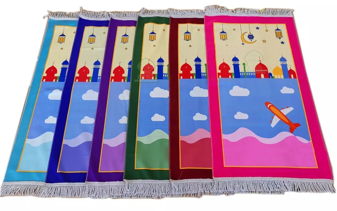 Tapis de prière (sajjadah) pour un enfant ou ado qui ne dépasse pas 1m60. Idéal pour les enfants à partir de 5 ans. Photo non contractuelle les contours peuvent être de couleurs différentes.
