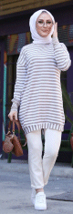 Pull - Tunique longue à rayures (Vêtement moderne femme voilée) - Couleur beige et blanc - REF. 32525 (19.90 €) - En Promotion à 16.90 €