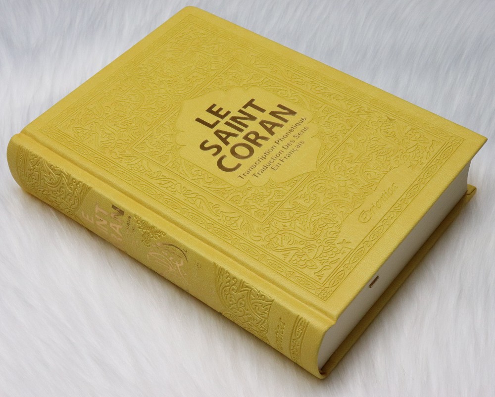 Le Saint Coran - Transcription phonetique (de l'arabe) et Traduction des sens en francais - Edition de luxe couverture cuir de couleur jaune dore