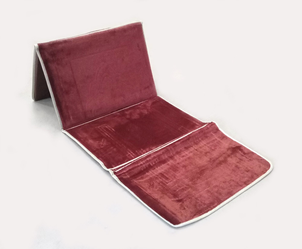 Tapis de prière musulman rembourré pliable et transportable avec sa sacoche de transport. Par une simple manipulation, se transforme rapidement de tapis à repose-dos (chaise, dossier, adossoire...)