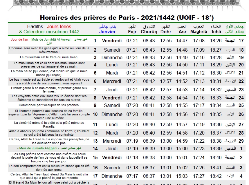 Calendrier musulman hégirien "Un Hadith par jour" (Hadiths en français) - Heures des prières de votre ville - Année 2026 (1447-1448 de l'hégire) - Horaire prière UOIF - REF. 14817 (2.90 €)