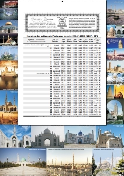 Vous recevrez ce nouveau calendrier musulman 2026 (1447-1448 de l'hégire) bilingue (français/arabe) avec les horaires de prières précises relatives à votre lieu d'habitation (commune). Inutile de préciser voter ville, nous vous enverrons le calendrier des horaires relatives à votre adresse de livraison.